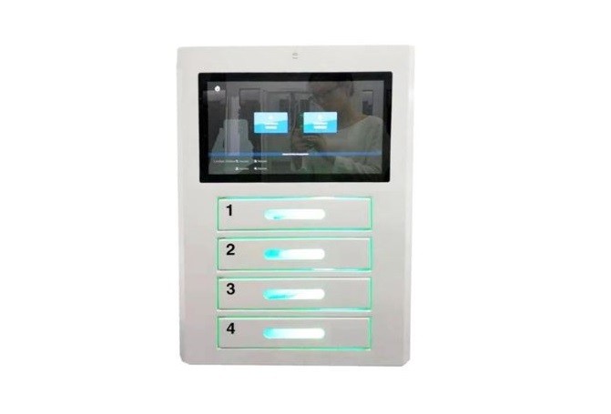 Tótem de carga de teléfono celular innovador montado en la pared, tiene un diseño compacto, integra casillero de depósito, cargador de teléfono y pantalla de publicidad LCD de 19 pulgadas como «tres en uno». Para que las personas puedan dejar su teléfono celular en la estación de carga .
